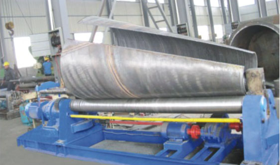 本機(jī)結(jié)構(gòu)型式為三輥對稱式,上輥在兩下輥中央對稱位置作垂直升降運(yùn)動,通過絲桿絲母蝸桿傳動而獲得,兩下輥作旋轉(zhuǎn)運(yùn)動,通過減速機(jī)的輸出齒輪與下輥齒輪嚙合,為卷板板材提供扭矩。本機(jī)床結(jié)構(gòu)緊湊,操作維修方便,該機(jī)缺點是板材端部需助其他設(shè)備進(jìn)行預(yù)彎。